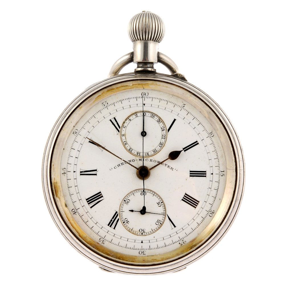 SoldChrono-Micrometer. An 18K gold open face keyless wind chronograph pocket watch Chrono-Micrometer...Chrono-Micrometer. An 18K gold open face keyless wind chronograph pocket watch Chrono-Micrometer. Chronographe de poche à cadran ouvert en or jaune 18K (750) remontoir au pendant Date: Circa 1890See Sold Price