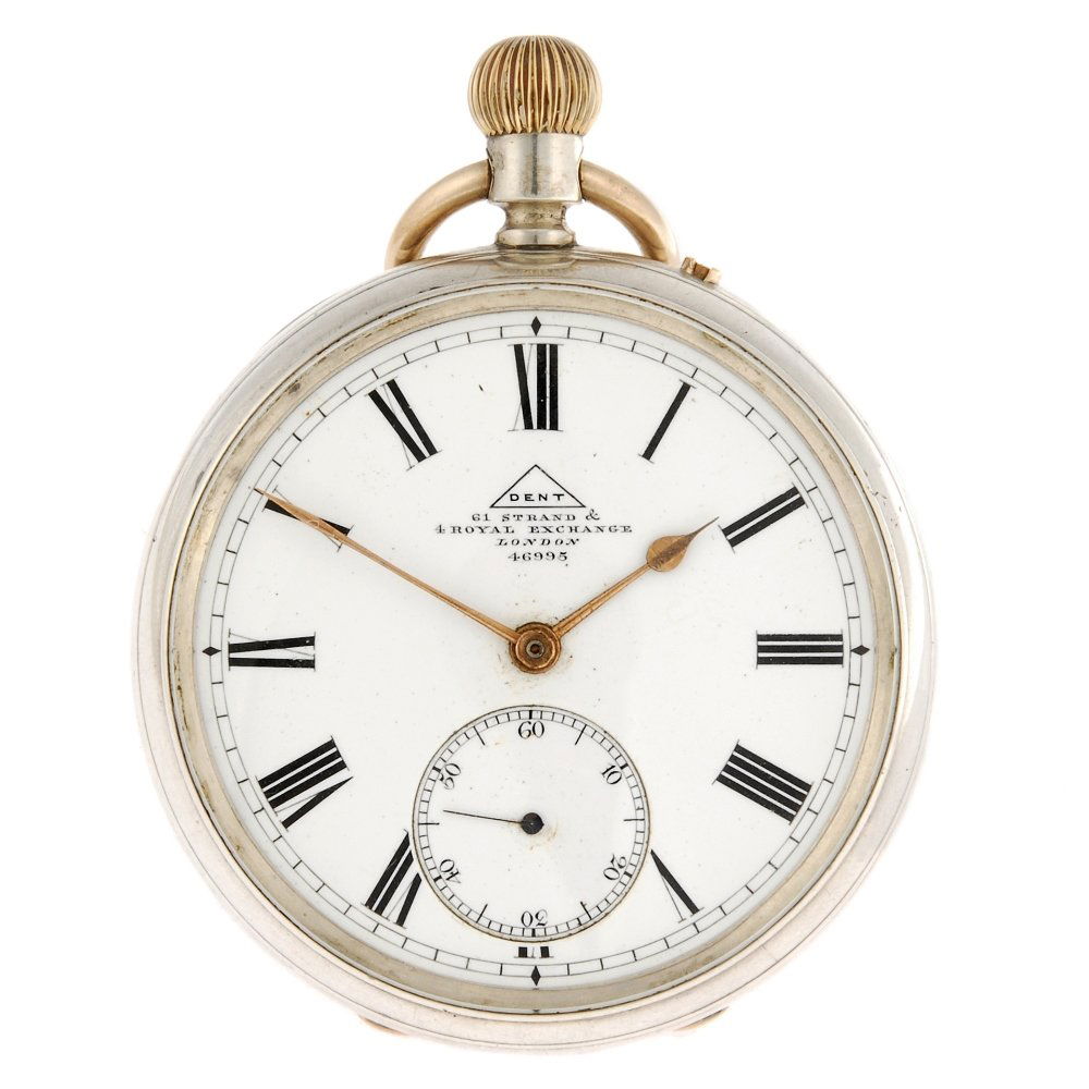 A silver keyless wind open face Dent pocket watch with