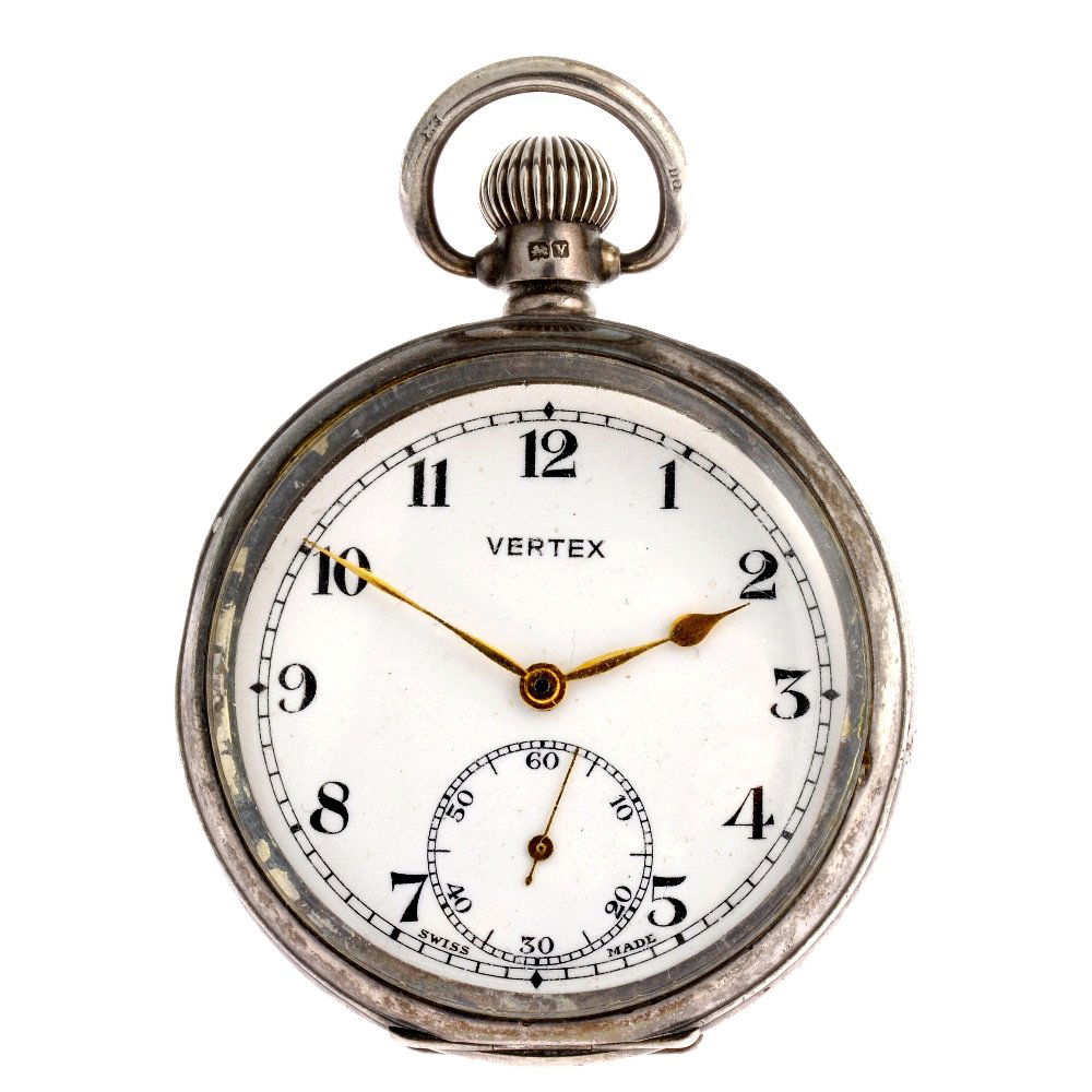 A silver keyless wind open face Vertex pocket watc