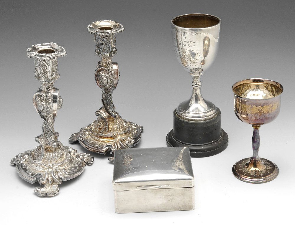Group Lot of Silverplate22 hrs LeftLot of sterling silver dresser accessories, including various covered glass jars and scent bottles.Mar 01, 2026Lot of sterling silver tableware. Various handled baskets and dishes, all except for one withoutMar 01, 2026(17) COLLECTION OF STERLING, .800 SILVER & WEIGHTED STERLING TABLE ARTICLESFeb 22, 2026Sterling Silver Estate TablewaresFeb 24, 2026A Collection of 4 EAPG Pressed Glass Tableware ArticlesFeb 18, 2026Collection of silver consisting of pepper and salt shakers, jugs, bell, bowl and statue of a boy,4 days Left4 Sterling Silver Table Articles and an Oyster SaltFeb 26, 20264 Sterling Silver Trumpet VasesFeb 26, 2026Four Sterling Table Articles Including a Wine Coaster and OthersFeb 21, 20268 Sterling Silver Baby and Table ArticlesFeb 26, 20267 Sterling Silver Table ArticlesFeb 26, 20265 Sterling Silver Table ArticlesFeb 26, 2026(7) English silver trophies, China eventsFeb 19, 2026Alvin Manufacture Sterling Silver TablewaresFeb 24, 2026Group of 5 Silver ArticlesFeb 26, 2026