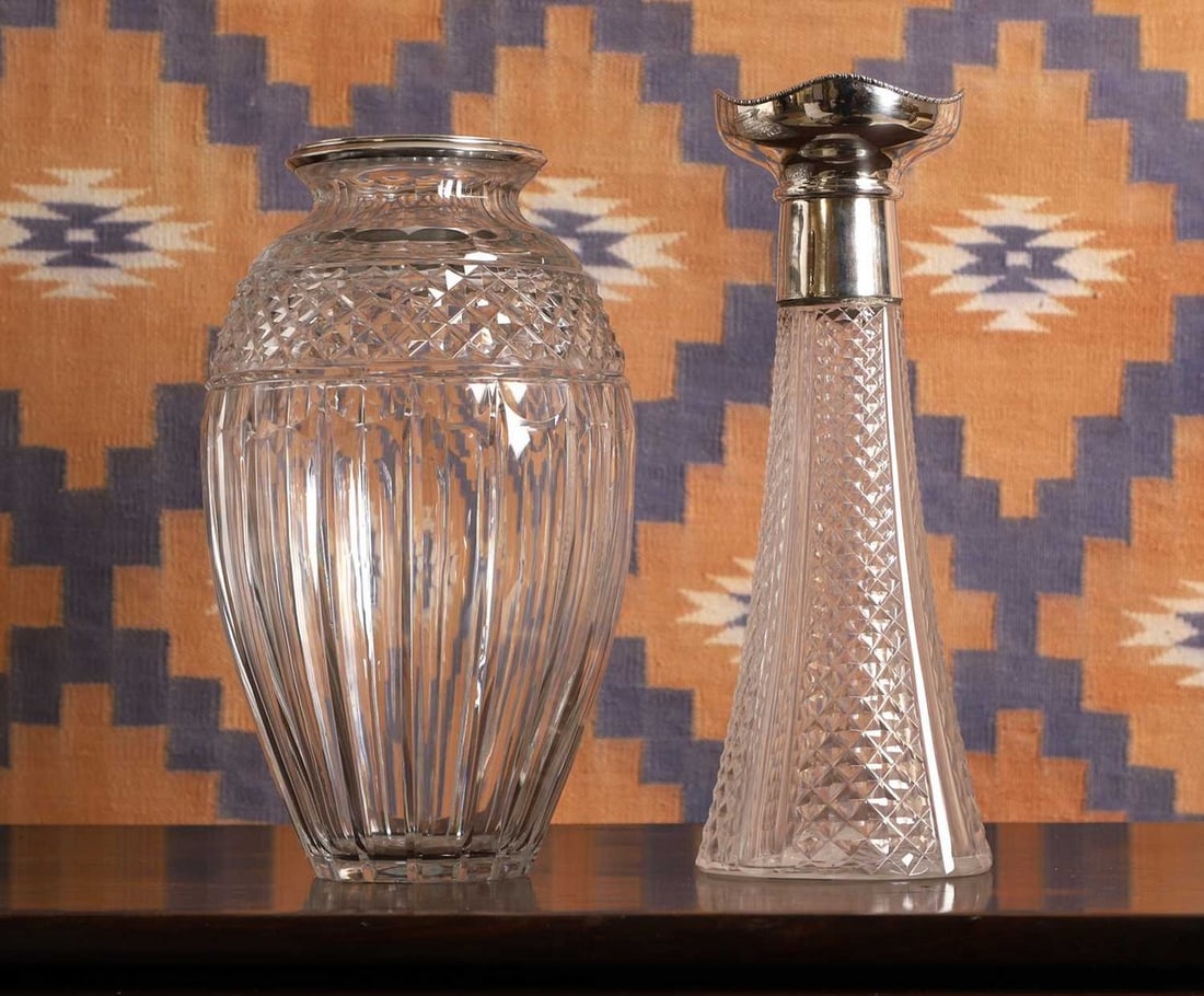 SoldCut Glass and Sterling VaseA cut glass vase, with .925 sterling silver mounted top, monogrammed 'W', 9"hSee Sold Price