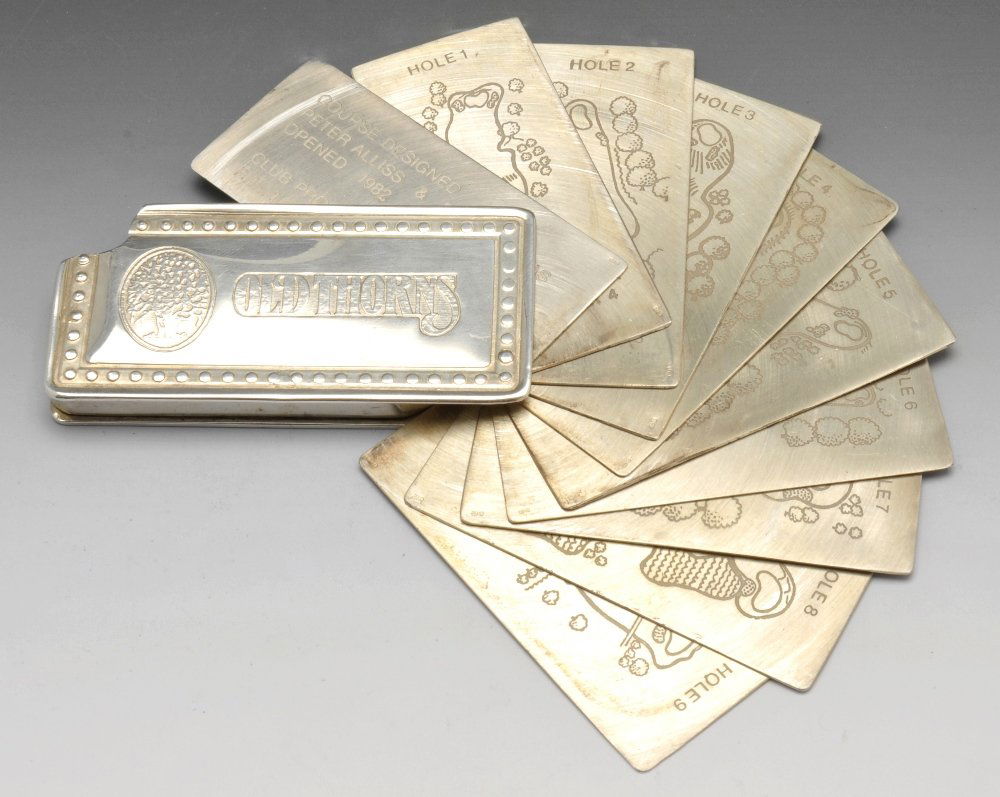 A silver mounted Old Thorns golf course card holder.