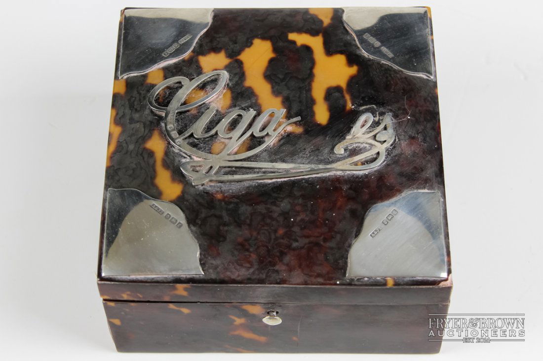 A silver mounted tortoiseshell cigarette box, of square