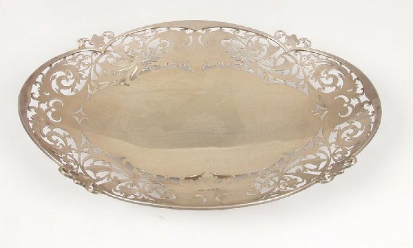 A silver oval dish with pierced foliate