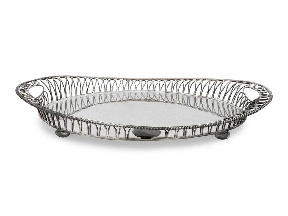 SoldA Large Reticulated Silverplate Gallery TrayA Large Reticulated Silverplate Gallery Tray20th century, rectangular form with curved corners and shaped rim, reticulated overlapping circular pattern gallery and cylindrical foliate double handles,See Sold Price