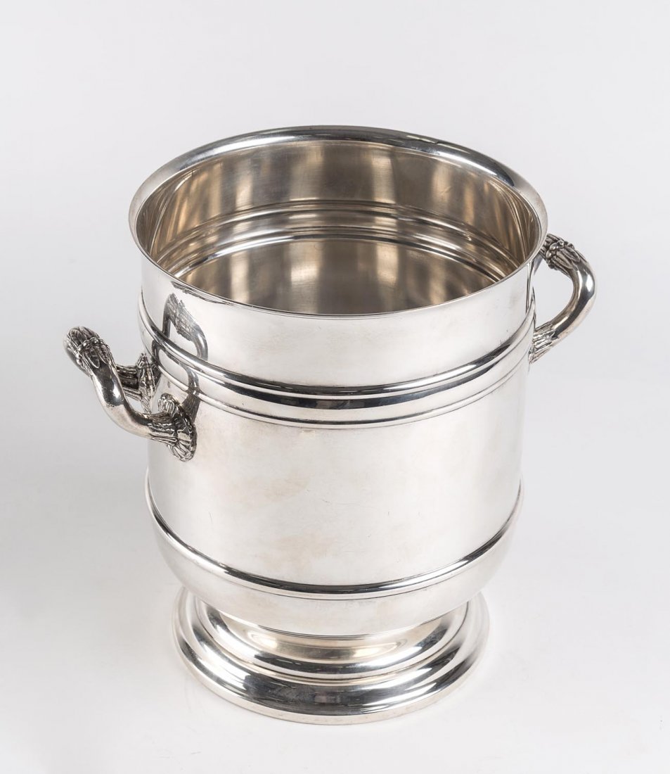 A silver plated circular twin handled wine cooler by
