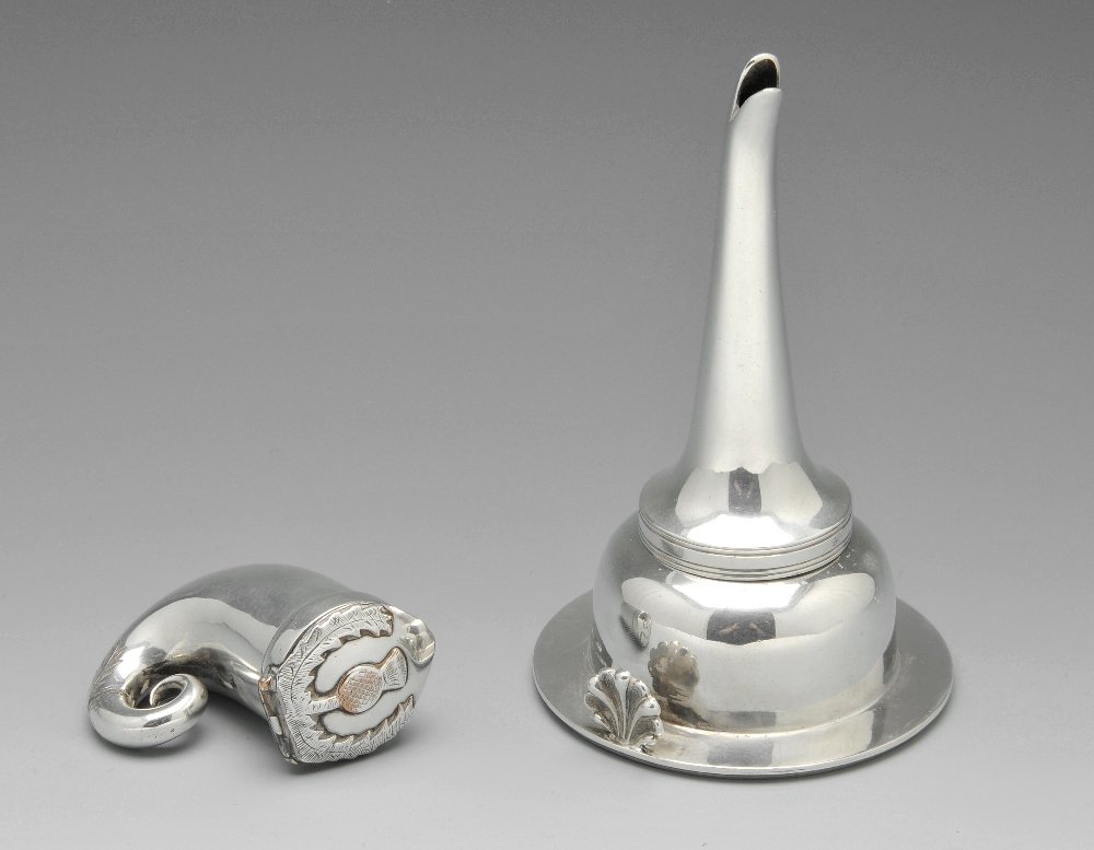 A silver plated wine funnel and a snuff mull.