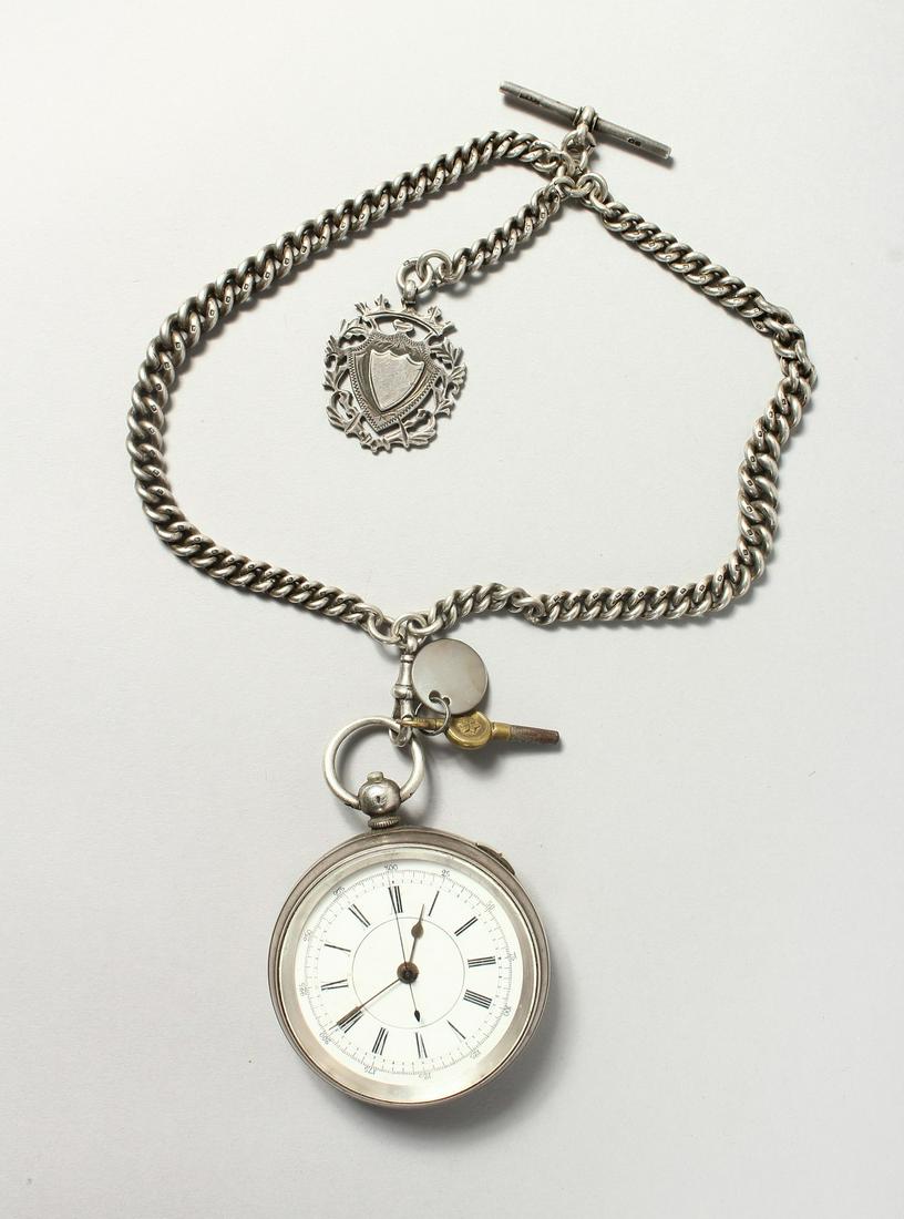 A SILVER POCKET WATCH AND CHAIN.