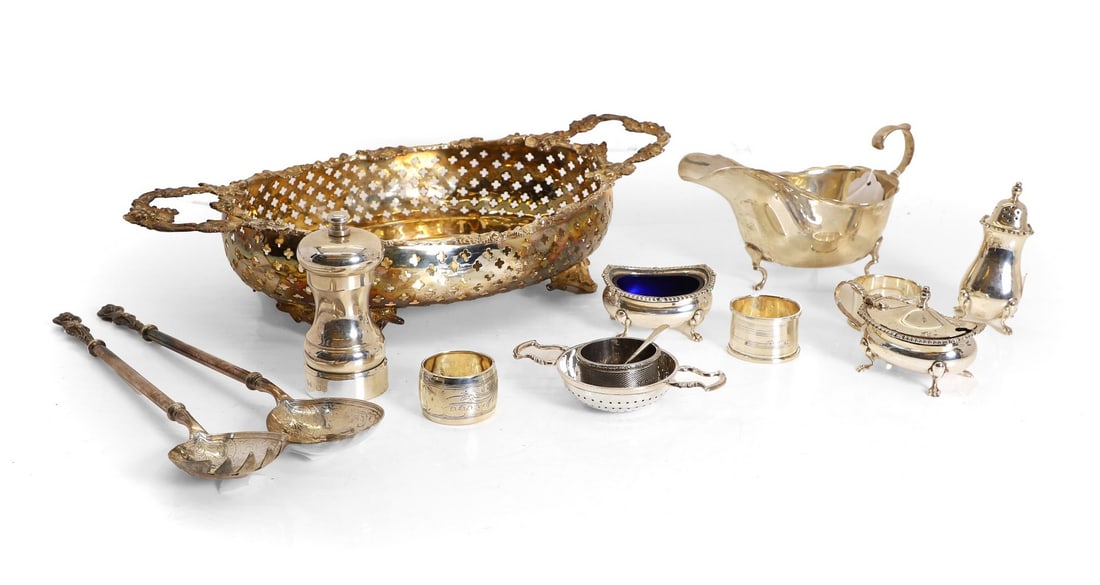 Lot of Assorted Sterling Silver Pieces, 60.79 Troy Ounces5 days LeftLarge Lot Sterling Silver, incl; Nut Dishes, Porringers, Gravy/Sauce Boat, Flatware, S & P,17 hrs LeftVintage Metal Lot including Aluminum Trays with Fruit and Flower, Moka Stovetop Espresso Pot, Bell253 Lots AwayMexican Sterling Silver Lot, incl; Sauce/Gravy Dish, Liner & Ladle (4"h x 7"w), 2 Sterling Cordials17 hrs LeftCHRISTOFLE, TIFFANY & CO, ENGLISH SILVER PLATE DISCOVERY LOTMar 21, 2026Silverplate and Sterling SilverMar 20, 2026Collection of Antique & Vintage Silver Plated Tea & Coffee Ware TeapotsCollection of Antique & Vintage Silver Plated Tea & Coffee Ware TeapotsSTERLING SILVER & COIN SILVER COLLECTIONMar 21, 2026A group of .800 standard and sterling silver articles17 hrs LeftFour Articles of Sterling Silver including PorringerMar 20, 2026United States Navy Silverplate Serving PiecesApr 12, 2026Four Antique Silver Pieces incl SterlingMar 20, 2026Collection of Sterling Silver Hostess Wares2 days LeftA collection of silver tea wares various makers and dates (5)William Adams, Etc. Silver Plate Tableware, 8 Pcs.3 days Left