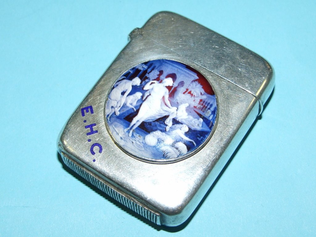 A Silver Vesta Case, Later Applied A Plaque Decorated