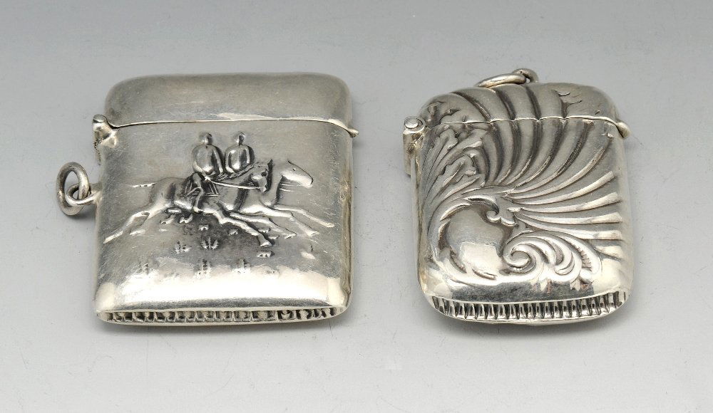 SoldA RUSSIAN SILVER CIGARETTE CASE WITH A HINGED LIDA silver cigarette case with a hinged lid and a push-button lock. Chased on the top side with a horse riding scene and decorated with an engraved floral pattern on the other. The interior contains a dSee Sold Price