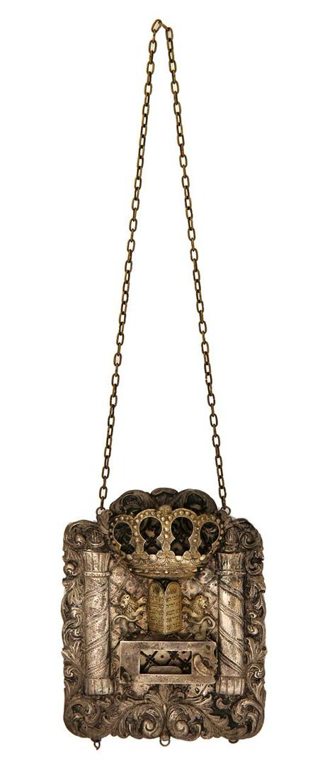 A small breastplate for a Torah scroll, hallmarked silv