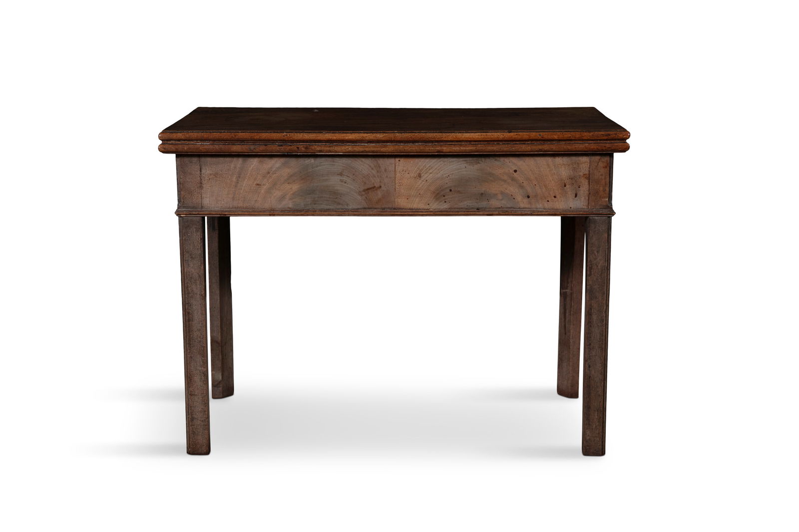 A SMALL GEORGE III FOLD OVER TEA-TABLE the solid panel top enclosing plain interior above a figur