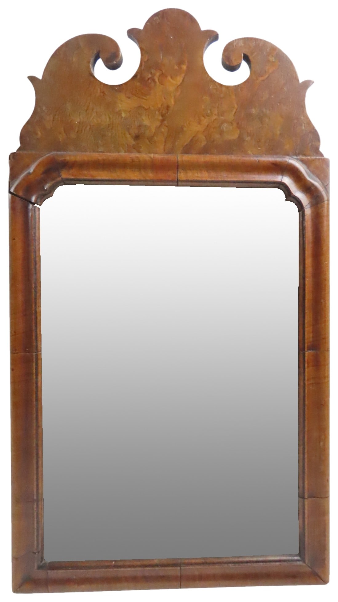 A SMALL REGENCY WALNUT WALL MIRROR CIRCA 1810 the rectangular bevelled plate enclosed within a