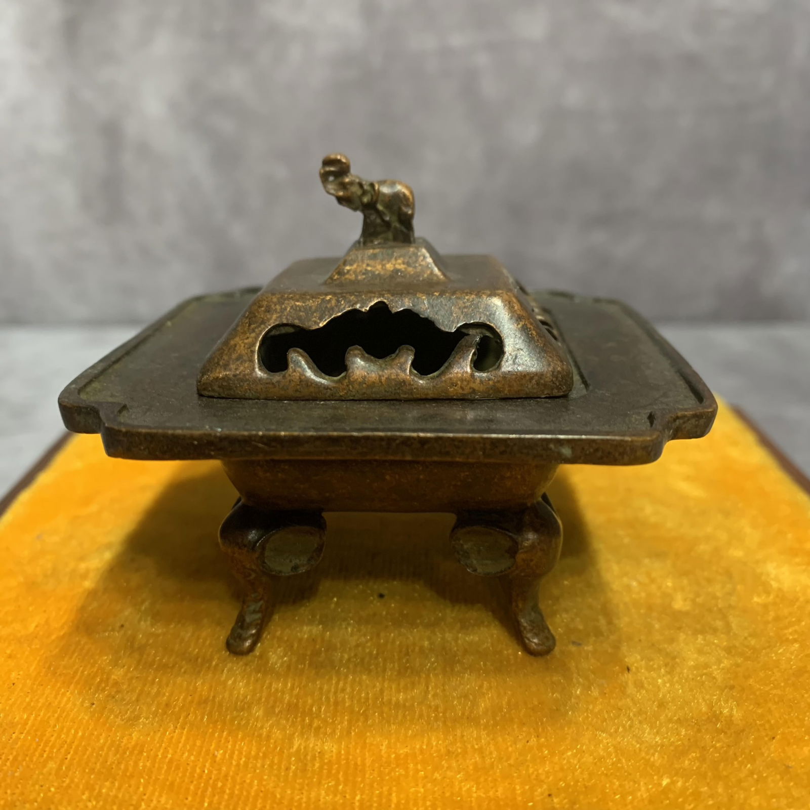 SoldSQUARE - SHAPED BRONZE INCENSE BURNER WITH CARVED WOODEN PEDESTALMeasurements: L. 9 cm. W. 6 cm. H. 11 cm. Weight 420 grams. This is a bronze incense burner with a wooden base. The incense burner has a square - shaped body, with mottled patina and marks of time, inSee Sold Price