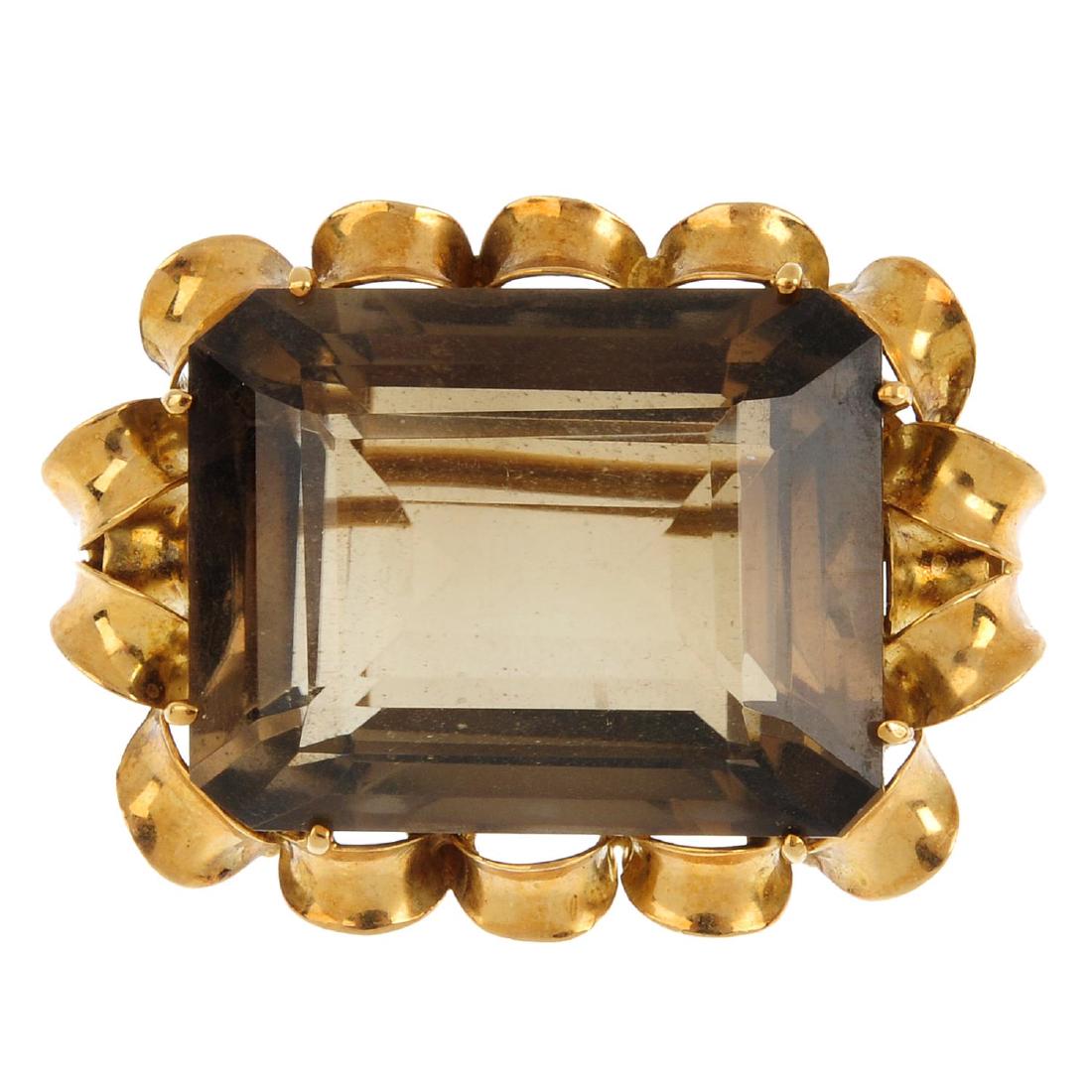 SoldSMOKEY QUARTZ RINGSMOKEY QUARTZ RING Containing one rectangular cut smokey quartz measuring approximately 21.80 x 16.05 x 12.15 mm. Mounted in yellow gold. Ring size 5 3/4.Stamp: 14K.Gross weight: 9.10 dwt. PSee Sold Price