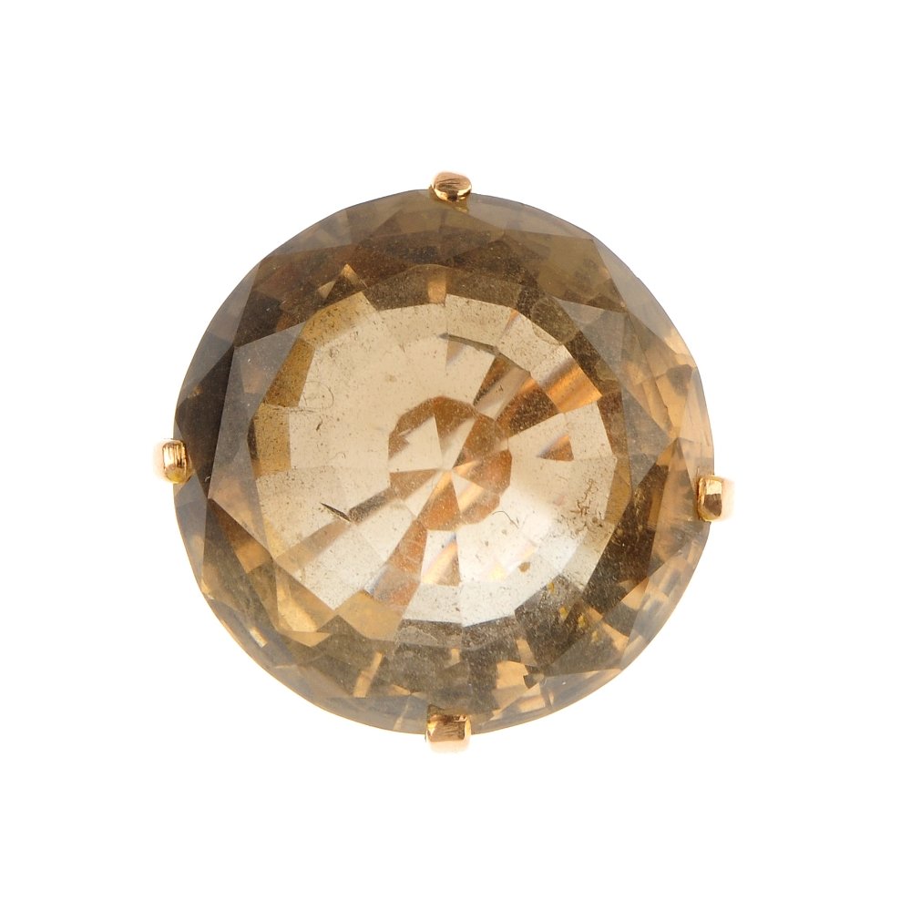 Sold14k rose gold smokey topaz ring14k rose gold smokey topaz ring, one round faceted smokey quartz stone measuring 18mm in diameter, fancy under-gallery with scroll design, size 6, unmarked, tests 14k, weight 8.0 gramsSee Sold Price
