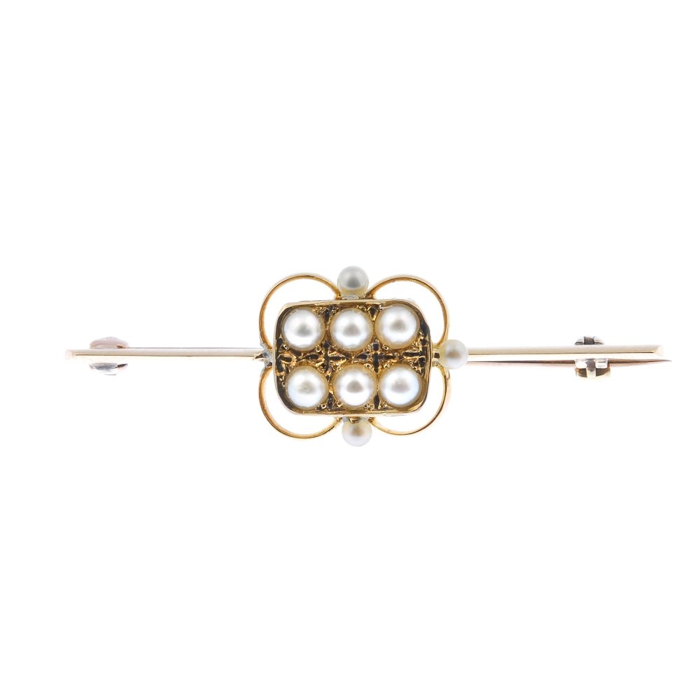SoldFour gem-set brooches. To include a late Victorian goldFour gem-set brooches. To include a late Victorian gold seed and split pearl floral bar brooch, a mid 20th century diamond single-stone bar brooch, a 9ct cultured pearl brooch and a later 9ct gold emeSee Sold Price