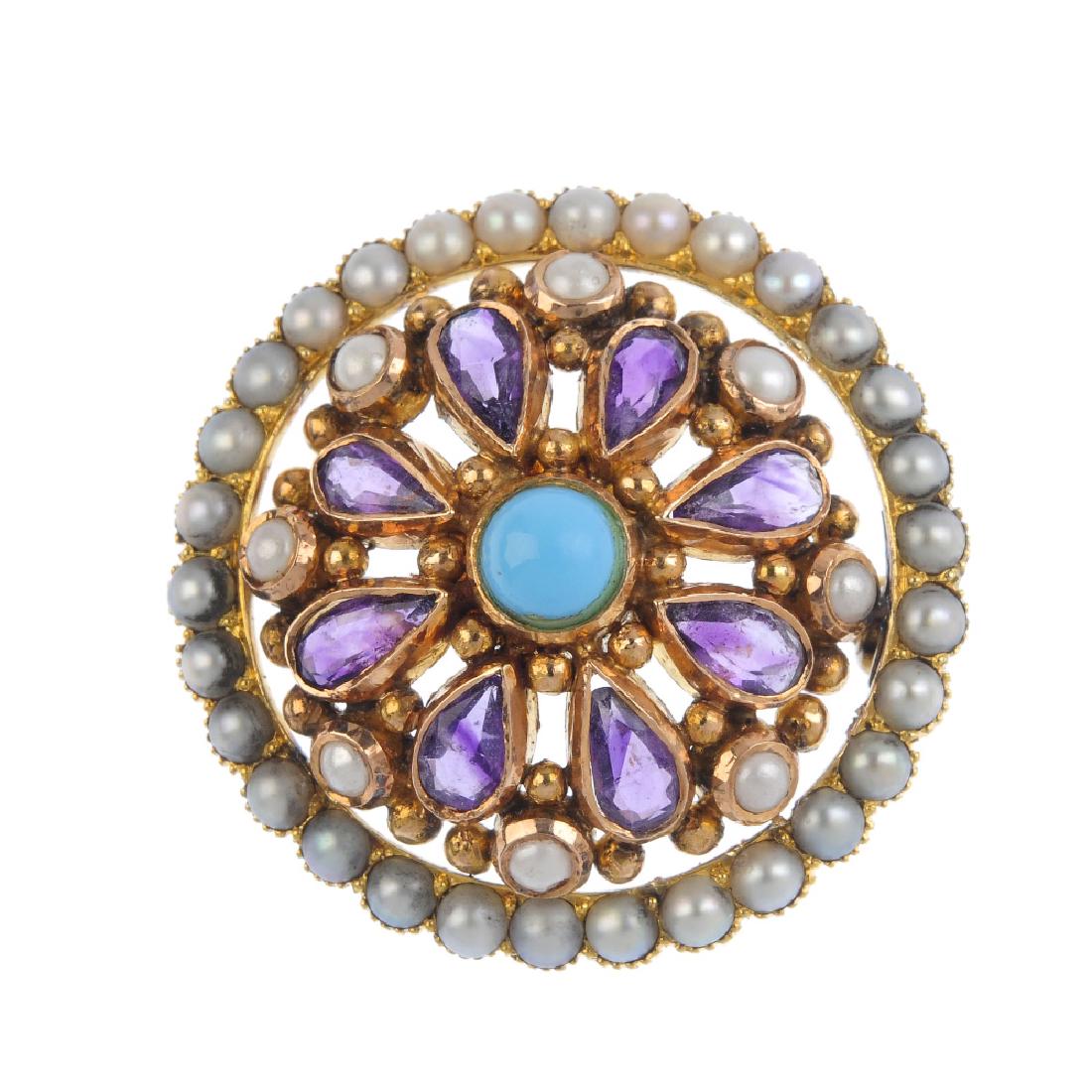A split pearl, amethyst and paste brooch. Of openwork