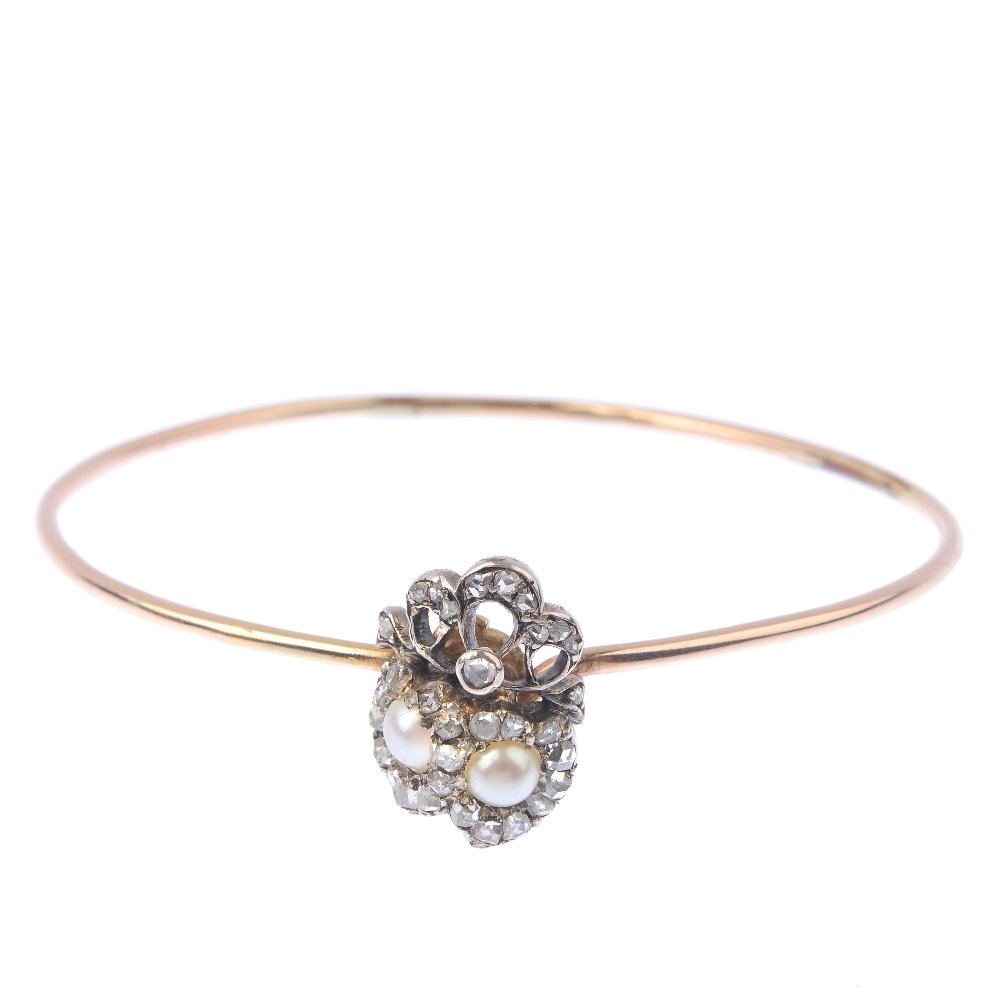 SoldA diamond and split pearl hinged bangle. The old-cutA diamond and split pearl hinged bangle. The old-cut diamond, with split pearl asymmetric shoulders and knife-edge half bangle. Inner diameter 5.8cms. Weight 8gms.See Sold Price
