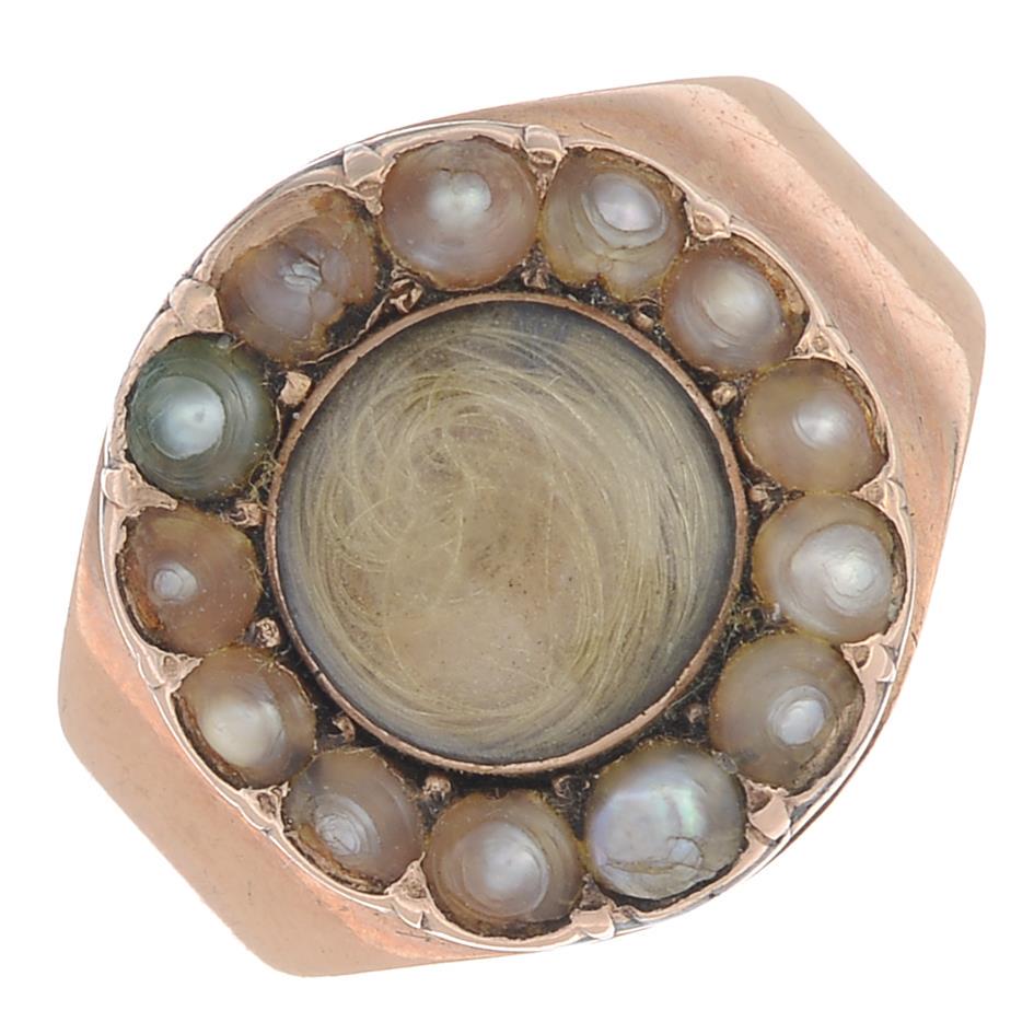 A split pearl and hairwork memorial ring.Ring size P.