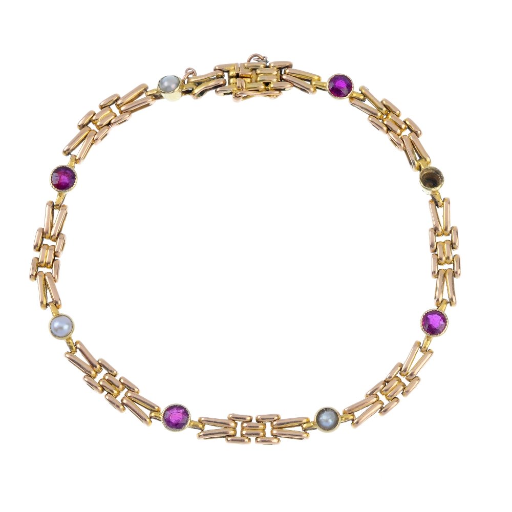 SoldYELLOW GOLD, CULTURED PEARL AND RUBY BRACELETYELLOW GOLD, CULTURED PEARL AND RUBY BRACELET Containing 12 pearls measuring approximately 7.20 mm in diameter, 24 seed pearls and 24 round mixed cut rubies. 7 inches long. Stamp: 14K. 18.10 dwt.See Sold Price