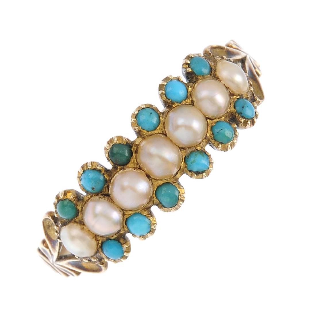 A split-pearl and turquoise ring. The split-pearl line,