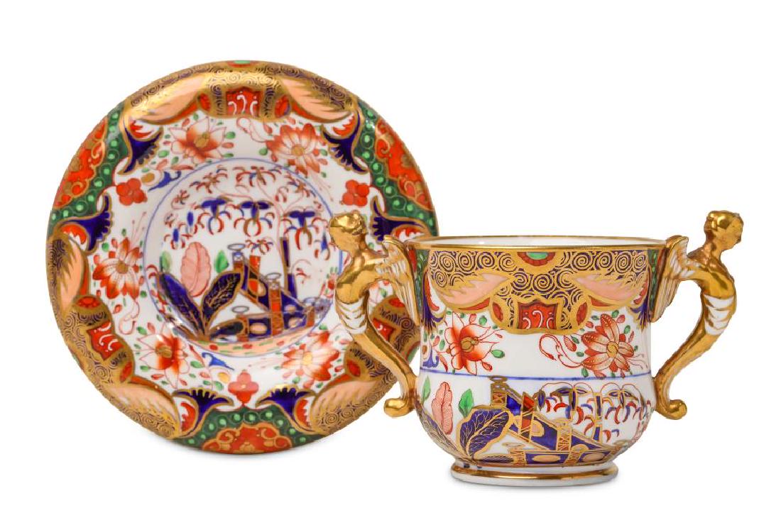 A SPODE PORCELAIN CHOCOLATE CUP AND STAND