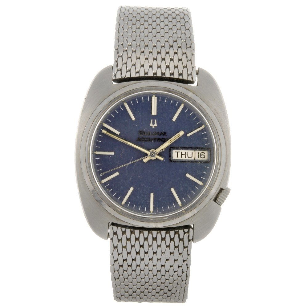 1970 Bulova Accutron 2182 Stainless Steel Case Black & Silver Bullseye Dial Speidel Bracelet 34.92mmBulova Accutron wristwatch featuring a black and silver bullseye (sector-style) dial with concentric two-tone design. Dial reads ACCUTRON with applied hour markers, tuning fork logo, red sweep seconds