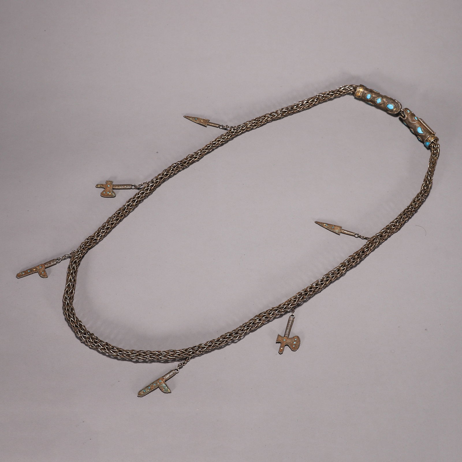 A STRING OF SILVER ORNAMENTS.