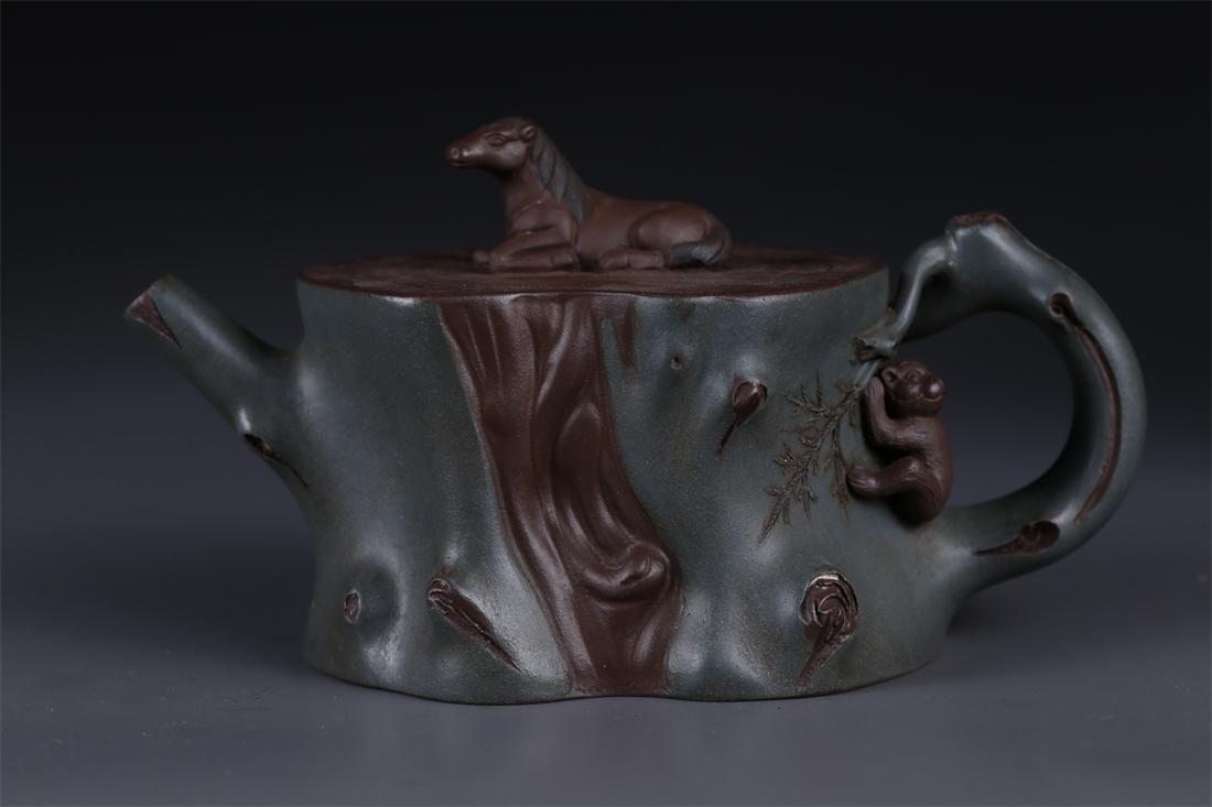 A STUMP SHAPED PURPLE CLAY TEAPOT.