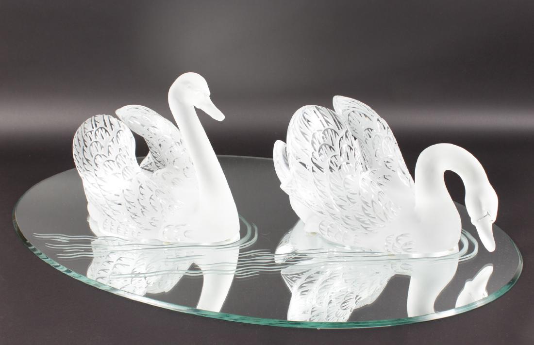 A SUPERB LALIQUE SWAN TABLE CENTREPIECE formed as two