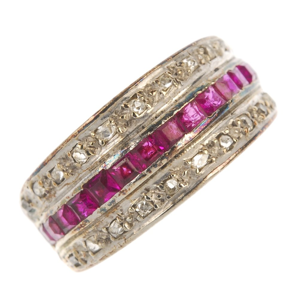 SoldLADIES ART DECO STYLE 14K Y.G., RUBY & DIAMOND RINGA yellow gold mount set with three rows of square cut rubies totaling approx. .50 ct. Ring garnished with full cut round diamonds totaling approx. .10 ct. Ring size 6 1/8.See Sold Price