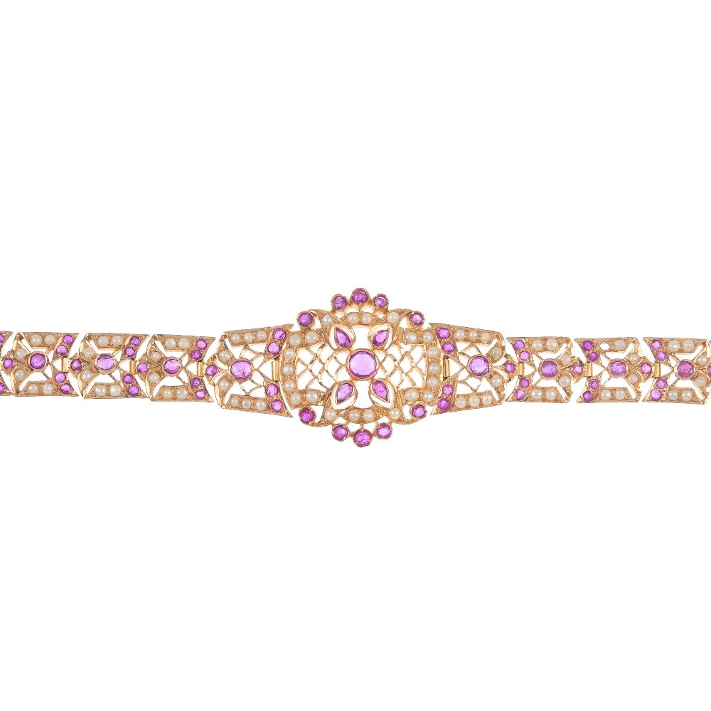 A Synthetic Ruby And Split Pearl Bracelet. The Front