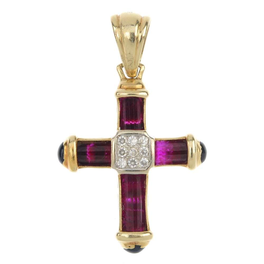 A synthetic ruby, paste and sapphire cross pendant.