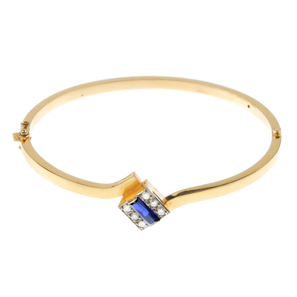 A synthetic sapphire and diamond hinged bangle.