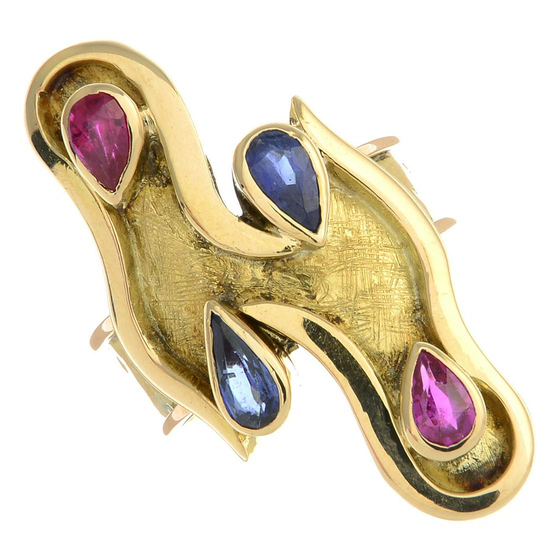 A synthetic sapphire and synthetic ruby ring.Ring size