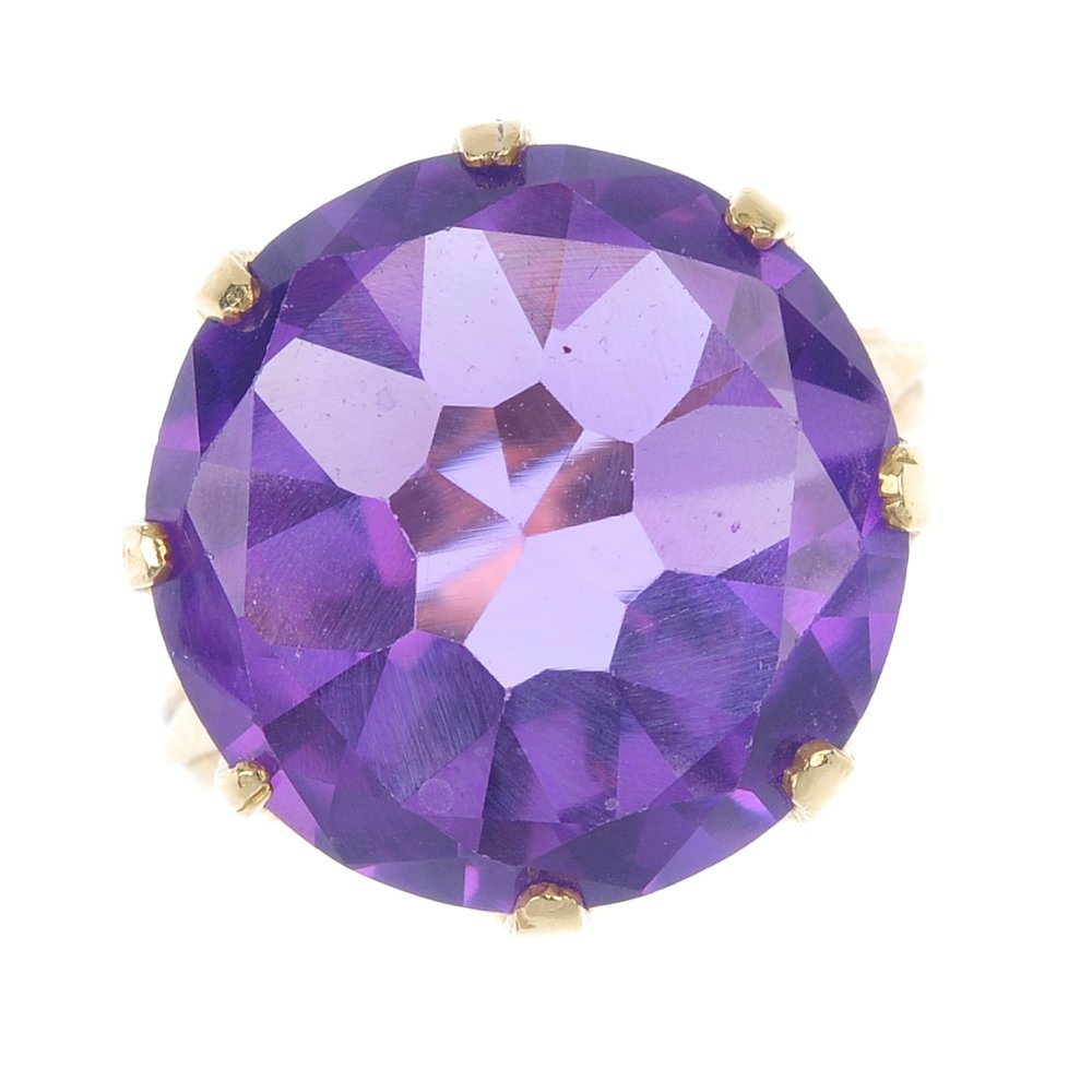 A sythetic colour change sapphire single-stone ring.