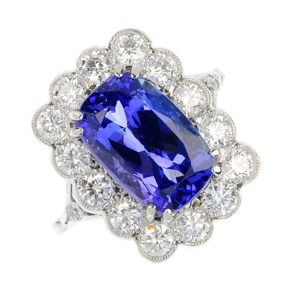 SoldA TANZANITE AND DIAMOND CLUSTER RING in platinum, set with an emerald cut tanzanite of 2.85 carats,A TANZANITE AND DIAMOND CLUSTER RING in platinum, set with an emerald cut tanzanite of 2.85 carats, in a border of round brilliant cut diamonds totalling 1.0-1.2 carats, stamped 950, size M / 6, 8.2g.See Sold Price