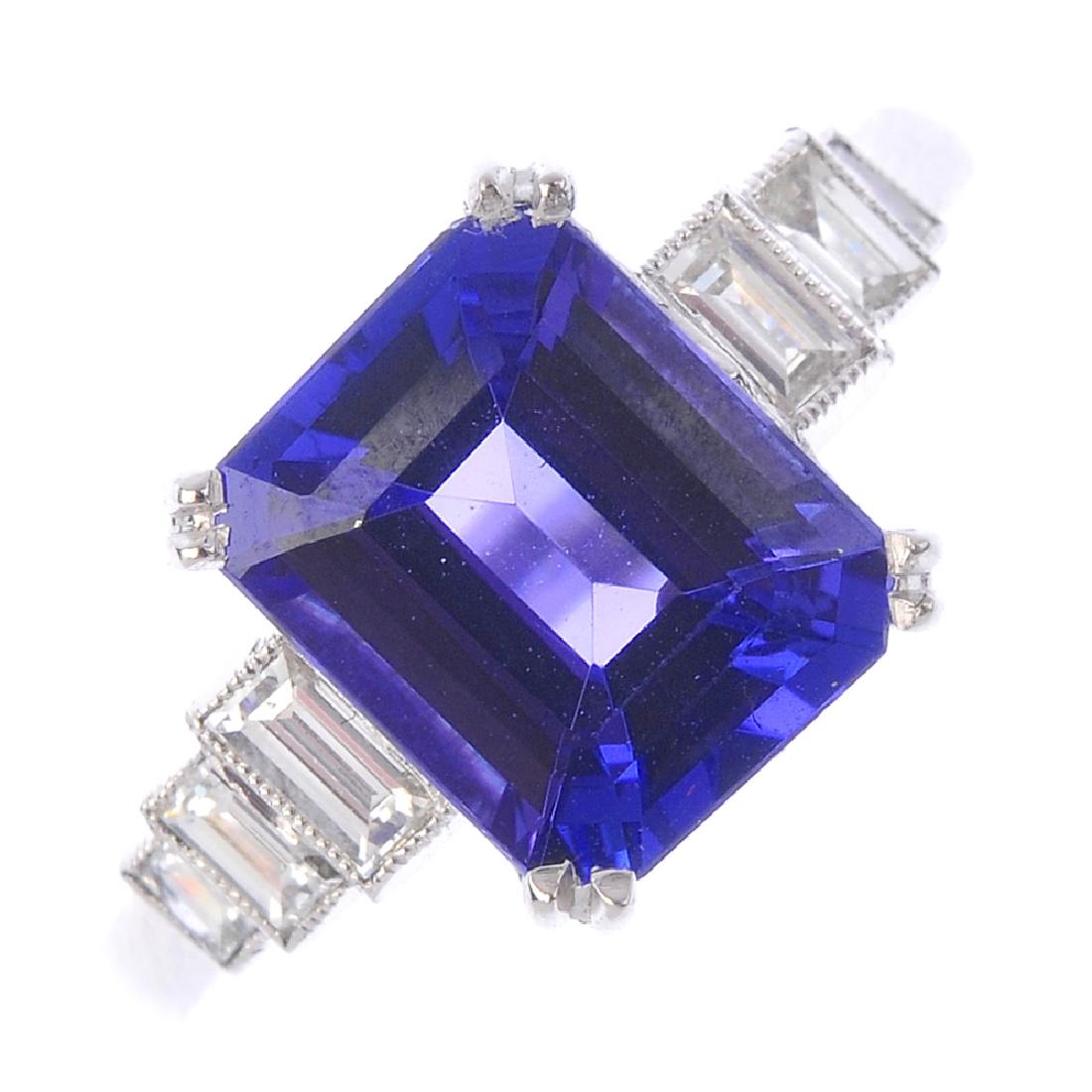 A tanzanite and diamond ring. The rectangular-shape