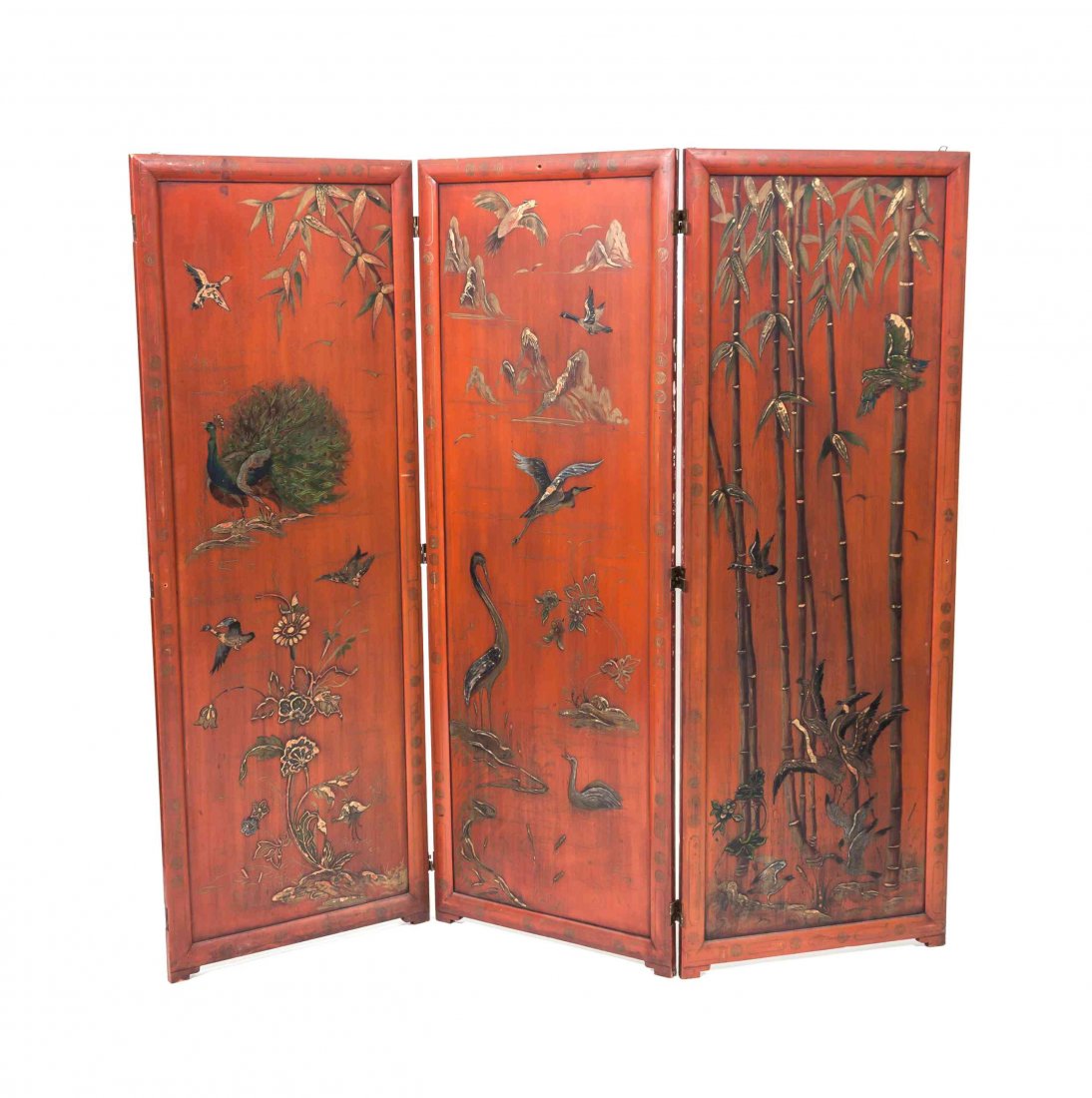 A Three-Panel Lacquer and Gilt Decorated Floorscreen,