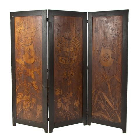 A Three Panel Pyrographic Floor Screen, Height 64 5