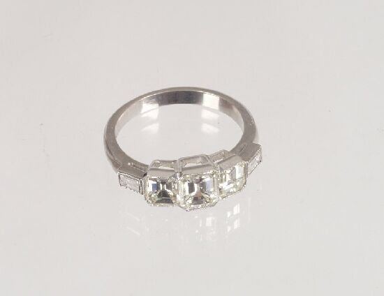 A three stone trap cut diamond Deco sty