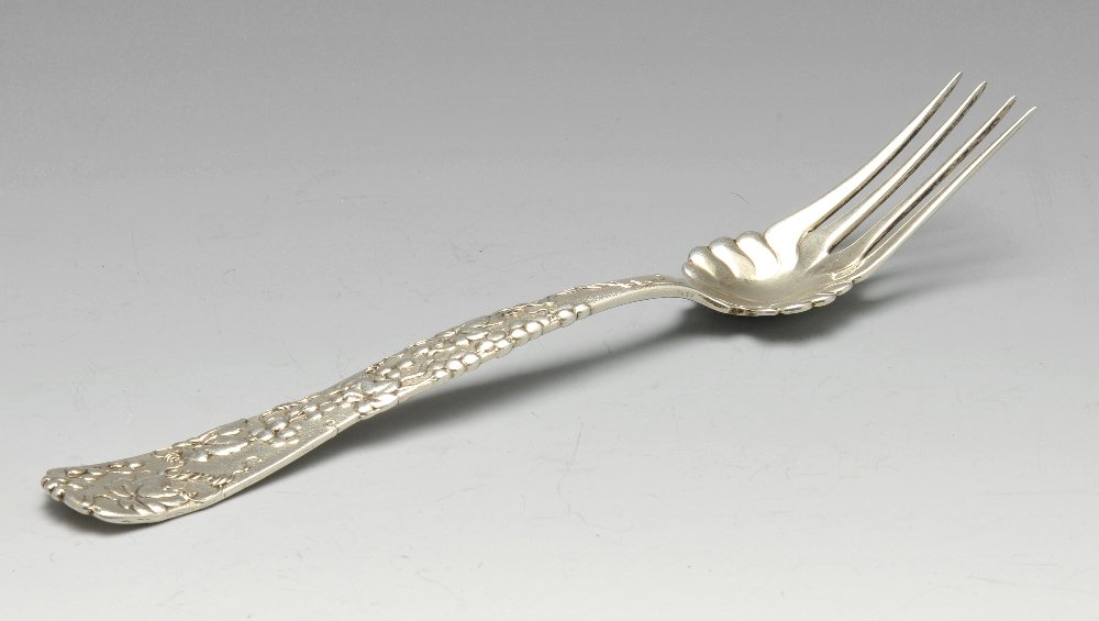 SoldTiffany & Co. Sterling Silver Cold Meat Serving Fork in Grape VinesTiffany & Co. sterling silver cold meat serving fork in grape vines. Beautiful hand chased grape vines to the handles. Scalloped edges to the tines. Tiffany & Co. sterling silver marks to the verso. WSee Sold Price