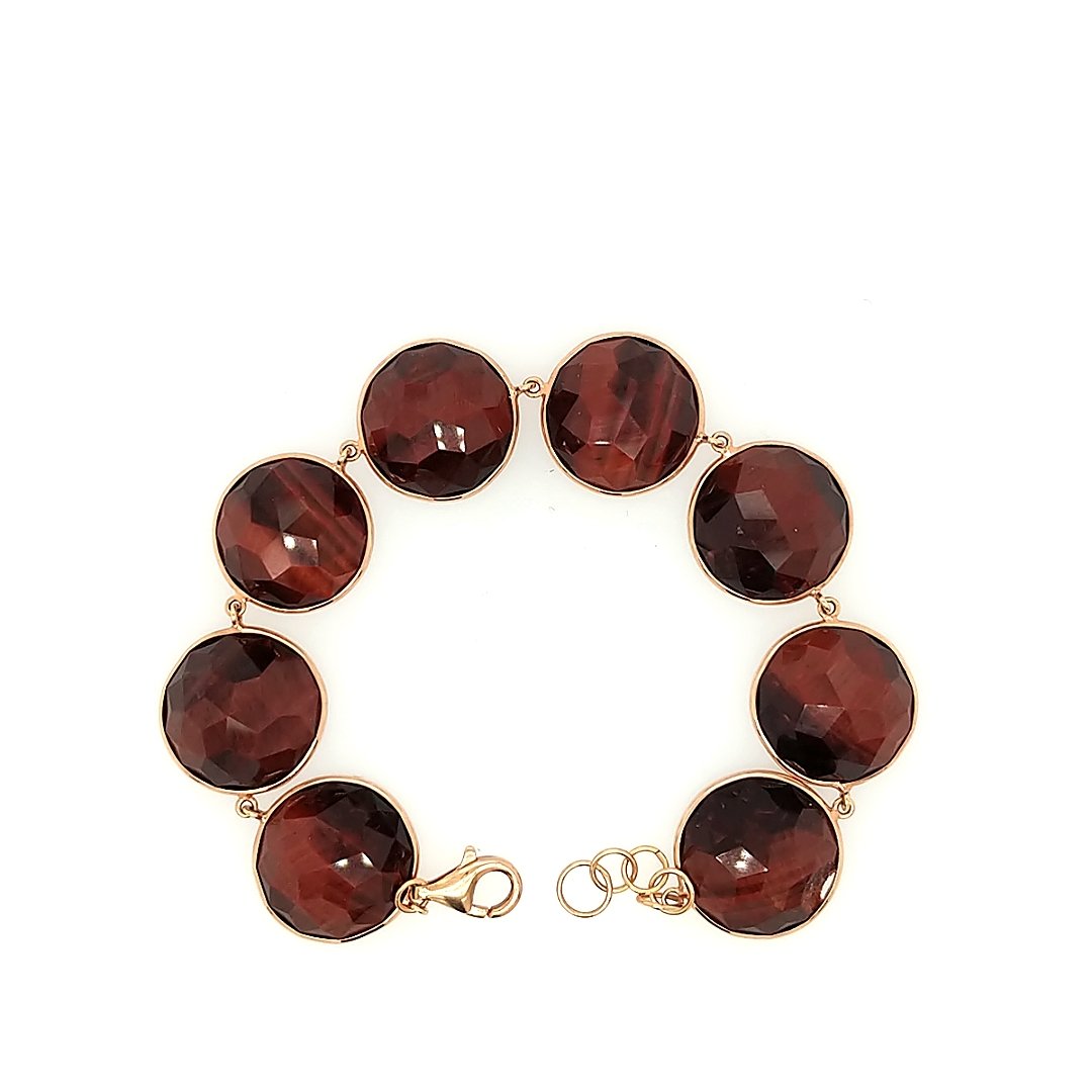 SoldA tiger's eye bracelet. Designed as a series of ovalA tiger's eye bracelet. Designed as a series of oval dyed tiger's eye cabochon collets, with rope-twist surround and fancy-link spacers. Length 18.5gms. Weight 21.3gms.See Sold Price