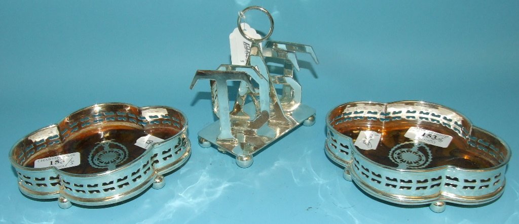 A TOAST rack, and two silver plated wine coasters (3)