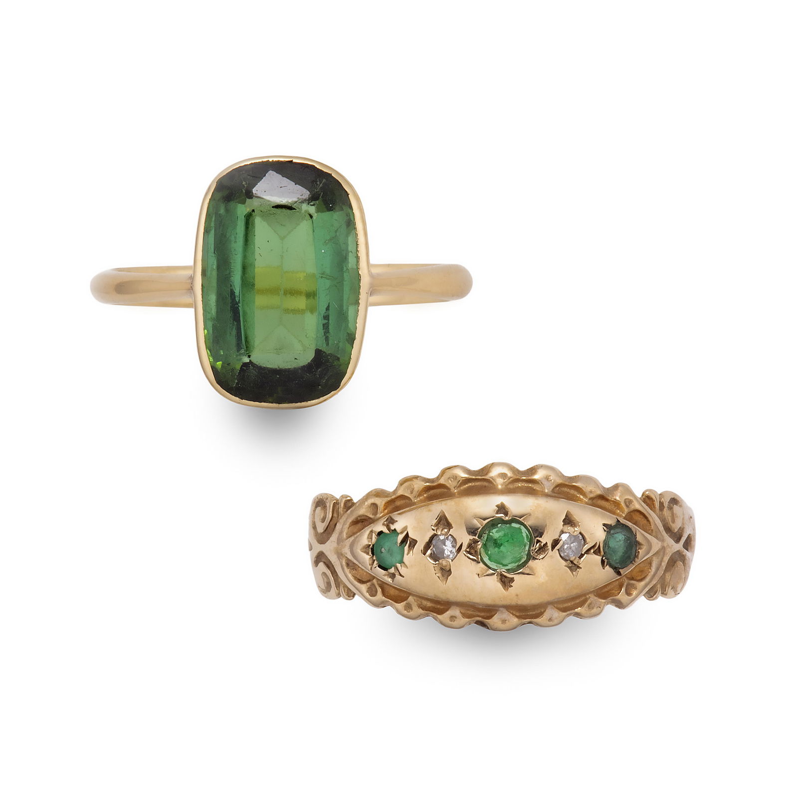 SoldA tourmaline and diamond three-stone ring. TheA tourmaline and diamond three-stone ring. The circular-shape green tourmaline line, with single-cut diamond spacers. Ring size L. Weight 3.2gms.See Sold Price