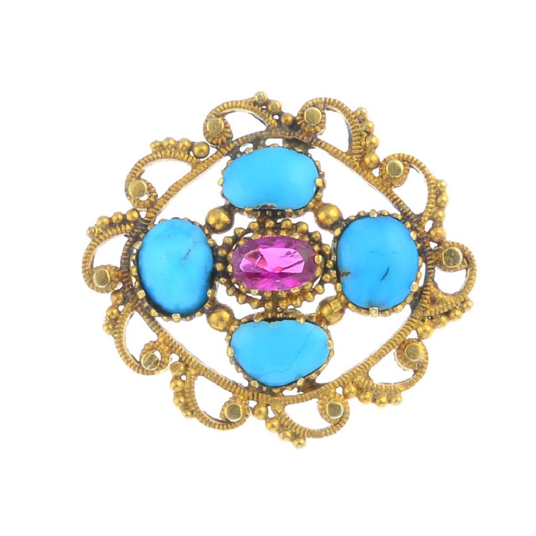 A turquoise and ruby brooch. Of openwork design, the