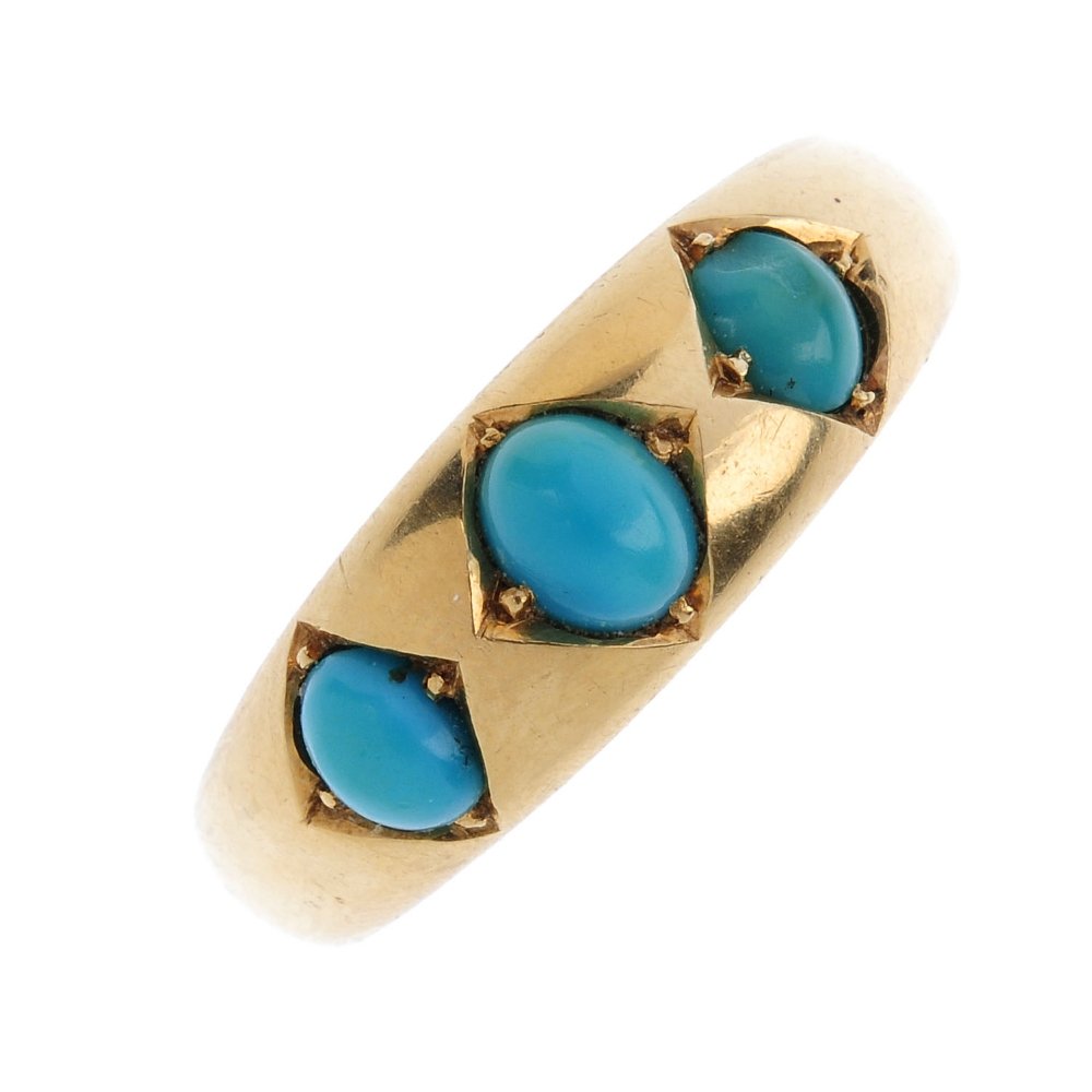 A turquoise three-stone ring. The graduated oval