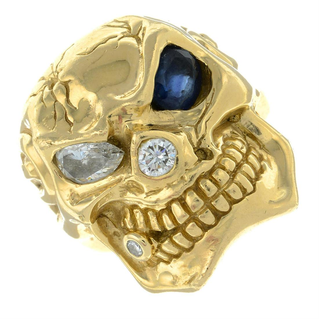 A vari-shape diamond and sapphire ring, designed as a skull.